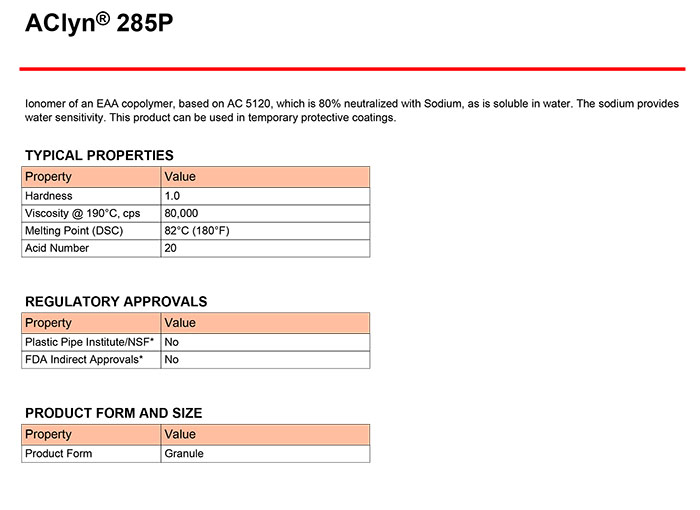 - 霍尼韋爾EAA離聚物蠟粉AClyn® 285P 結(jié)晶成核劑 物性表, 霍尼韋爾EAA離聚物蠟粉AClyn® 285P 結(jié)晶成核劑 產(chǎn)品參數(shù),霍尼韋爾EAA離聚物蠟粉AClyn® 285P 結(jié)晶成核劑 性能表,霍尼韋爾EAA離聚物蠟粉AClyn® 285P 結(jié)晶成核劑 出廠報(bào)告, MSDS,, 物質(zhì)安全資料表, UL黃卡,{ SGS報(bào)告, RoHS, 食品級(jí)認(rèn)證, NSF飲用水標(biāo)準(zhǔn), 產(chǎn)品資料, 產(chǎn)品性能, 出廠報(bào)告, 原廠原包, 代理商, 熱變形溫度, 熔指數(shù), 流動(dòng)系數(shù), 抗沖擊性能、沖擊強(qiáng)度, 低溫韌性、低溫抗沖擊性能, 熔體流動(dòng)系數(shù)、熔體流動(dòng)速率, 加工工藝、加工參數(shù)、加工溫度, 歐盟RoHS 德國(guó)FDA 美國(guó)FDA 日本FDA