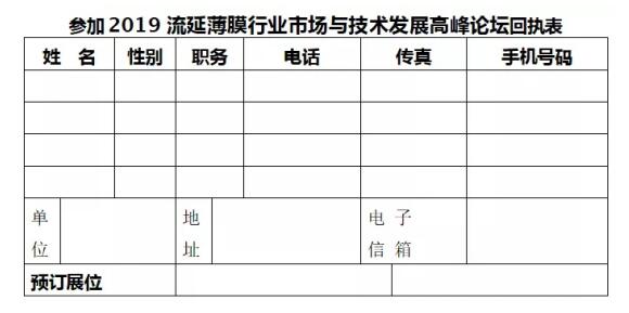 1、請(qǐng)將上述回執(zhí)表于2019年12月20日前發(fā)郵件到ppack@126.com或發(fā)微信到13693270591(流延薄膜)。