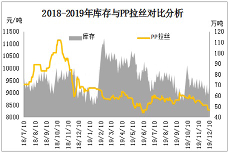 2019年12月庫存顯示整體呈現(xiàn)震蕩下滑趨勢,整體庫存維持在60-70萬噸/年,但全球經(jīng)濟(jì)偏弱運(yùn)行及國內(nèi)實(shí)體企業(yè)訂單力度不及預(yù)期,市場原料消耗力度受到制約。同時2019年P(guān)P新一輪擴(kuò)能高峰期再次來臨,浙江石化及大連恒力等大型聚烯烴裝置落地試運(yùn)行,市場供需壓力更加凸顯,加快現(xiàn)貨市場拉絲下挫壓力。