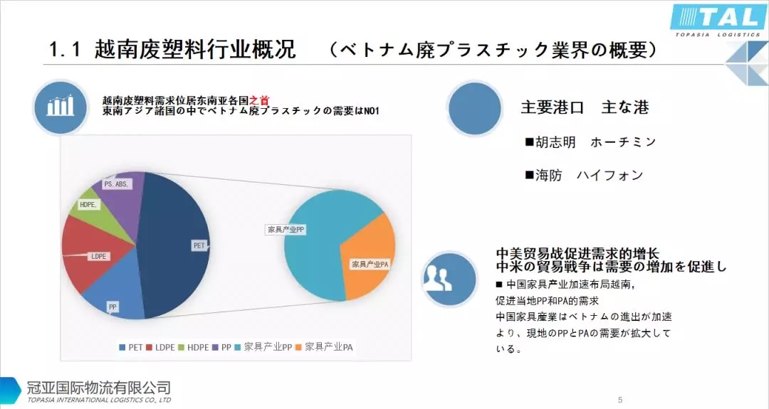 越南廢塑料需求位居?xùn)|南亞各國(guó)之首,再生塑料在越南的市場(chǎng)有PET,PP,PE,PS,ABS,PA。主要進(jìn)口港口:海防,胡志明。