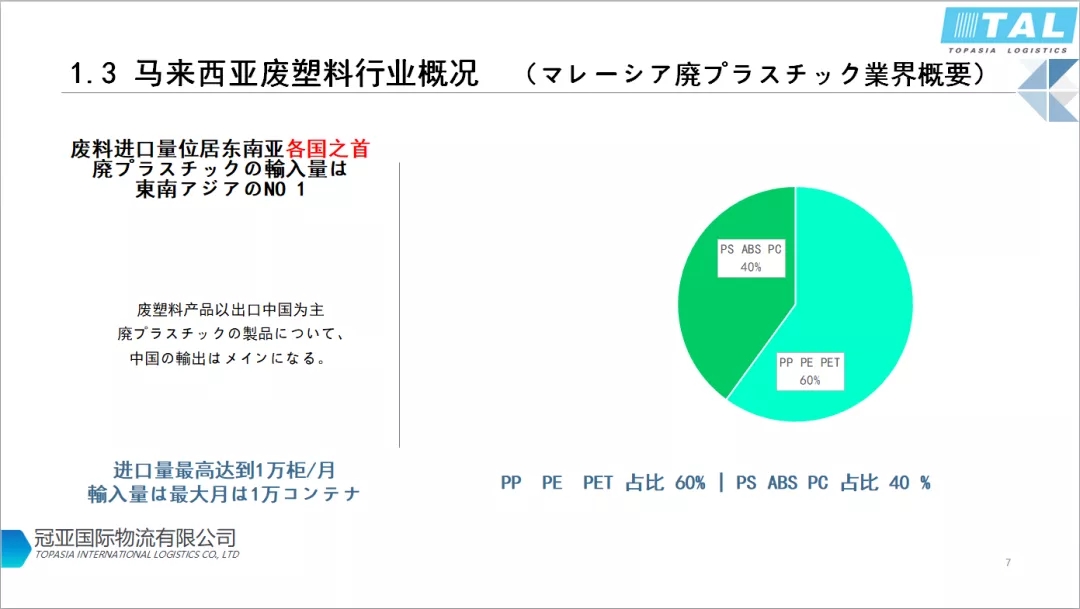 目前馬來(lái)西亞廢塑料進(jìn)口量是東南亞最大的。據(jù)海關(guān)統(tǒng)計(jì)每月有10000個(gè)集裝箱進(jìn)口。