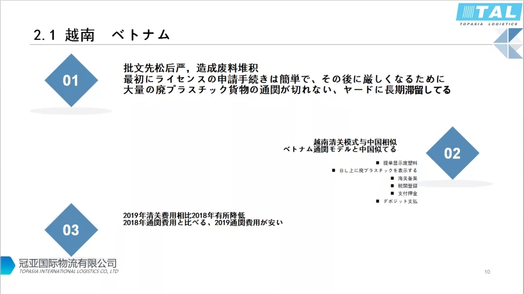 有批文的還是可以正常清關(guān),通關(guān)時(shí)間也很迅速。越南廢料的清關(guān)模式跟之前中國(guó)很像,提單必須顯示廢塑料,收貨人需要在海關(guān)備案,進(jìn)口報(bào)關(guān)的時(shí)間需要支付押金?,F(xiàn)在問(wèn)題是只有少數(shù)幾家船公司愿意接去越南的貨。相比2018年的情況,2019年下半年陸續(xù)出來(lái)很多新的批文,清關(guān)費(fèi)用也在逐步降低。