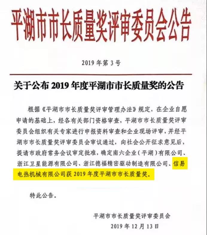 平湖市市長質(zhì)量獎是平湖市人民政府設(shè)立的最高質(zhì)量獎項,由平湖市政府表彰和獎勵,每年度評審一次,每屆不超過5個。該獎項旨在發(fā)揮市長質(zhì)量獎的導(dǎo)向作用,推動企業(yè)實施卓越績效模式和先進(jìn)質(zhì)量管理方法,深入開展質(zhì)量管理創(chuàng)新、質(zhì)量強(qiáng)企創(chuàng)建活動,樹立質(zhì)量標(biāo)桿,加強(qiáng)典型示范,加快推進(jìn)質(zhì)量強(qiáng)市建設(shè),促進(jìn)經(jīng)濟(jì)轉(zhuǎn)型升級。平湖信易2019年度獲此殊榮,深感榮幸,同時亦感到責(zé)任之深重,今后信易將繼續(xù)在精益管理,保證質(zhì)量,做好品牌等方面努力進(jìn)取,追求卓越,為塑膠輔機(jī)行業(yè)做出更大的貢獻(xiàn)。