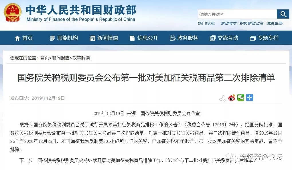 對(duì)附件清單所列商品,自2019年12月26日至2020年12月25日(一年),不再加征我為反制美301措施所加征的關(guān)稅。已加征的關(guān)稅稅款不予退還。