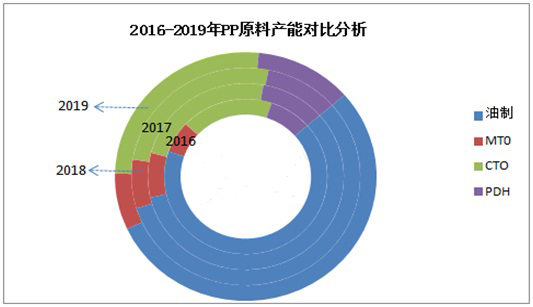 由2016-2019年P(guān)P原料產(chǎn)能對比分析發(fā)現(xiàn),煤制烯烴產(chǎn)能增速最快,由2016年336萬噸增加到2019年633萬噸,增加297萬噸。其中2016年煤制烯烴產(chǎn)能占比18%,2019年煤制烯烴產(chǎn)能占比已經(jīng)高達(dá)26%,占比增加8%,其增速令人驚訝。另外PDH系列也是增速較快產(chǎn)品,由于丙烷脫氫產(chǎn)品因成本優(yōu)勢明顯,后期擴(kuò)能產(chǎn)品也將呈現(xiàn)新得突破。原料多元化,市場競爭壓力也將逐步升級。