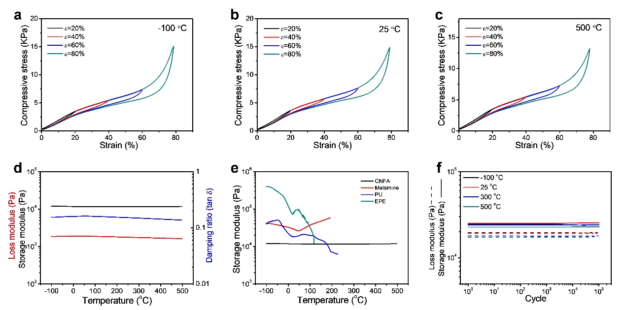圖2、CNFAs在T = -100~500℃時N2中的熱力學(xué)穩(wěn)定的力學(xué)性能。(a~c)形變?yōu)?0%、40%、60%和80%時CNFAs的壓縮應(yīng)力-應(yīng)變曲線,溫度分別為:a)-100 °C、b)25 °C和c)500 °C;(d)CNFAs在T = -100-500℃時的粘彈性(儲存模量、損耗模量和阻尼比);(e)CNFA、三聚氰胺、PU和EPE泡沫的儲存模量隨溫度的變化;(f)不同溫度下CNFAs在1×105次循環(huán)中的儲存模量和損耗模量。