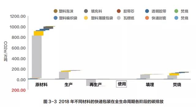 從圖 3-2 和圖 3-3 中可知,在 2018 年我國快遞包裝材料在生命周期各階段中(不包括再生),原材料階段(71.56%)的碳排放所占比重大,處置階段占比重較小(焚燒 9.79%,填埋6.68%),生產(chǎn)階段(11.97%)占比小。