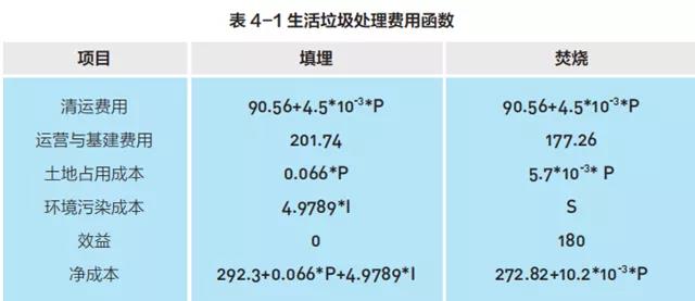 本文中的生活垃圾處置成本包括收集、運輸、轉(zhuǎn)運和處理成本,其中,垃圾處理相關(guān)費用包括:垃圾清運成本、運營和基建成本、土地占用成本、環(huán)境污染成本和效益,具體單位處理成本見表 4-1。垃圾填埋的環(huán)境成本包括垃圾填埋場主要的污染源——垃圾滲濾液的環(huán)境污染成本。焚燒處理的環(huán)境成本系通過疾病成本法來核算二噁英致癌成本。效益指垃圾焚燒發(fā)電收入;