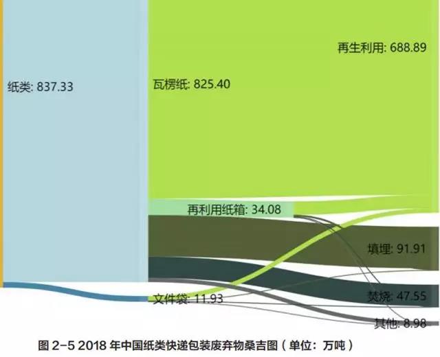 調(diào)查發(fā)現(xiàn)快遞紙箱類包裝廢棄物只有不到 5% 被重復(fù)使用,按重量計算約有 80% 的紙箱被回收,還有約 15% 混入生活垃圾。以 2018 年為例,我國快遞行業(yè)共消耗紙類包裝材料 837.33 萬噸(不包括快遞單號紙),其中文件袋用紙 11.93 萬噸,瓦楞紙箱、紙筒和膠帶芯等瓦楞紙消耗量 825.40 萬噸。這其中僅有約 34.08 萬噸的瓦楞紙箱被重復(fù)使用,通過流動回收業(yè)者回收的約有 688.89 萬噸快遞包裝廢紙(瓦楞紙 679.43 萬噸,文件袋 9.46 萬噸)。計算得到快遞紙類包裝產(chǎn)生量和流量信息如圖 2-5 所示: