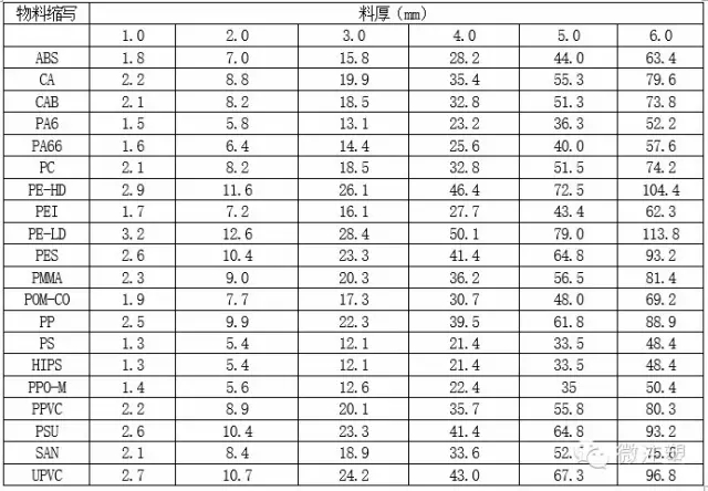 通用塑料不同料厚的冷卻時(shí)間(秒)
