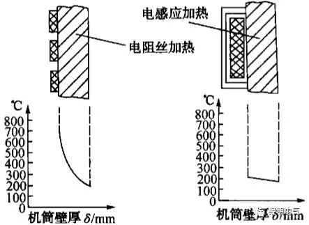圖1 電阻加熱器和感應(yīng)加熱器加熱機(jī)筒時(shí)的溫度梯度