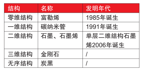 ????????石墨烯為碳的一種新的同素異構(gòu)體,截止到目前已開發(fā)的各類碳材料的不同同素異構(gòu)體如表1所示。