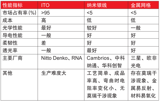 ????????納米銀線是一種直徑在納米范圍(一般在20-100納米之間)、長度沒有限制的金屬銀一維纖維。納米銀線具有體積小、比表面積大、良好化學(xué)性能和催性能、導(dǎo)電性能、抗菌性能和生理相容性,具體如表4所示。納米銀線的生產(chǎn)方法有:模板輔助、多元醇、光波輻射、軟化學(xué)溶劑熱等,多元醇法由于操作簡單、生產(chǎn)效率高、成本低廉成為當(dāng)前主流生產(chǎn)方法,缺點(diǎn)是產(chǎn)品濃度低。例如納米銀線可以生產(chǎn)透明柔軟塑料導(dǎo)電膜,具體結(jié)構(gòu)為基材為PET薄膜,涂覆層為納米銀線分散液,表層為丙烯酸保護(hù)涂層?;臑橹螌樱虚g涂層為透明導(dǎo)電層,保護(hù)層為保護(hù)銀不被氧化降低導(dǎo)電性能,主要替代ITO和金屬網(wǎng)透明導(dǎo)電薄膜。