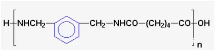 ????????尼龍-mxd6是由三菱氣體化學(xué)公司從m-xylenediamine(mxda)生產(chǎn)的廣泛的聚酰胺的通用名稱。它是由間苯二甲胺mxda與己二酸的縮聚而產(chǎn)生的結(jié)晶聚酰胺。與尼龍6和尼龍66不同,尼龍mxd6是一種脂肪族聚酰胺,其主鏈中含有一個(gè)芳環(huán)?;瘜W(xué)結(jié)構(gòu)如下: