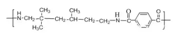 ????????英文名:polytrimethyl hexamethylene terephthalamide;transparent polyamide resin;透明尼龍是無定形聚酰胺,化學(xué)名稱為:聚對(duì)苯二甲酰三甲基己二胺。其分子結(jié)構(gòu)式為: