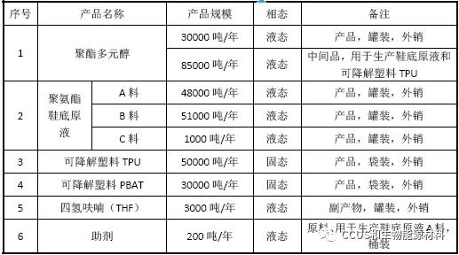 建設(shè)規(guī)模:年產(chǎn)10 萬(wàn)噸鞋底原液、3 萬(wàn)噸聚酯多元醇、8 萬(wàn)噸可降解塑料(5萬(wàn)噸/年TPU、3萬(wàn)噸/年P(guān)BAT)