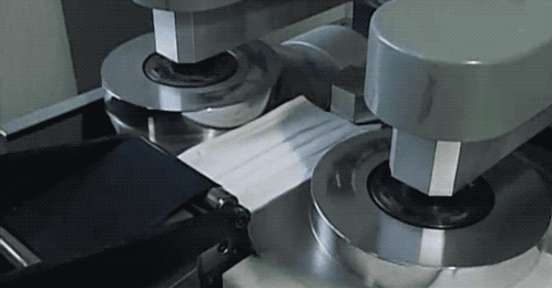 左右兩大卷無紡布,等著要補(bǔ)強(qiáng)口罩邊沿了。 一側(cè)被包裹之后,立刻壓平粘合。 這時候出來的原先已經(jīng)裁斷好的口罩們,再次被連到了一起,這真的是自古多情空余恨,此恨綿綿無絕期... 所以還需要一個裁斷補(bǔ)強(qiáng)邊的環(huán)節(jié),一刀兩斷...
