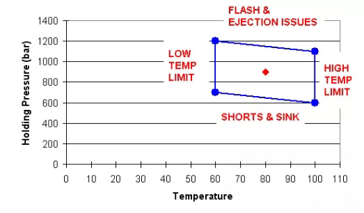 ????????成型視窗是非常重要的一個(gè)測(cè)試。通常這個(gè)外觀成型視窗是由保壓和料溫(無(wú)定形料)、保壓和模溫(結(jié)晶料)構(gòu)成。
