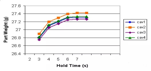 對(duì)冷流道模具或者半冷流道(熱轉(zhuǎn)冷),為保證模與模之間的可重復(fù)性,保壓壓力一定要持續(xù)到澆口完全冷卻。????????曲線生成以后, 選擇一個(gè)產(chǎn)品重量穩(wěn)定以后的時(shí)間。在上圖中,產(chǎn)品重量在7s后就不再增加,所以為安全起見(jiàn)同時(shí)彌補(bǔ)工藝本身的波動(dòng), 保壓時(shí)間要設(shè)定為8s。