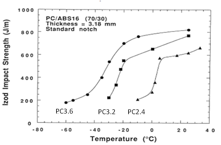 ????????由圖可見,PC分子量越高,其對應(yīng)PC/ABS的缺口沖擊強(qiáng)度越高,發(fā)生脆韌轉(zhuǎn)變的溫度越低。PC分子量較低的時(shí)候,其對應(yīng)PC/ABS沖擊強(qiáng)度隨溫度降低而下降的速度很快。如常溫(25℃)時(shí), PC3.6、PC3.2和PC2.4對應(yīng)的PC/ABS的缺口沖擊強(qiáng)度分別為800J/m、750J/m和600J/m,而在-10℃時(shí),其對應(yīng)值分別為750J/m、600J/m和200J/m,PC2.4/ABS沖擊下降明顯。因此,要制作高沖擊強(qiáng)度的PC/ABS,特別是對低溫沖擊有要求時(shí),一方面是盡量選擇分子量較高的PC原料,另一方面是盡量減少PC/ABS加工過程中的降解,防止PC分子量下降。