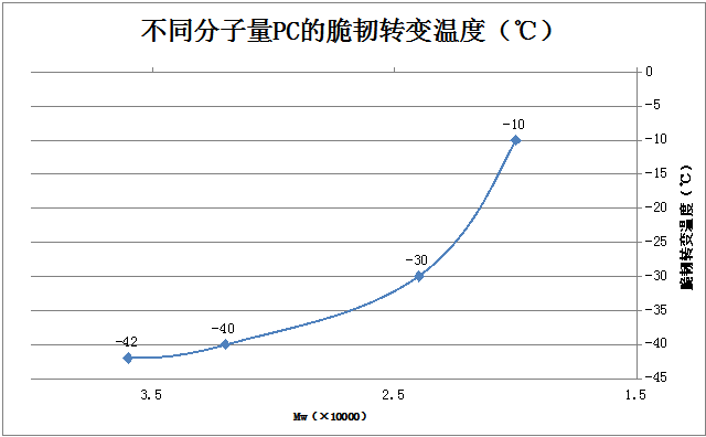 ????????對于有低溫韌性要求的材料來說,脆韌轉(zhuǎn)變溫度是一個(gè)重要參數(shù),PC分子量對其脆韌轉(zhuǎn)變溫度有重要影響。在PC分子量較高時(shí),其脆韌轉(zhuǎn)變溫度隨分子量下降而升高并不明顯,如PC分子量由3.6萬下降到3.2萬時(shí),其轉(zhuǎn)變溫度由-42℃只提升了2℃到-40℃;而PC分子量下降到中等分子量以下(≤2.4萬)時(shí),其脆韌轉(zhuǎn)變溫度快速上升,由PC2.4的-30℃上升20℃到PC2.0的-10℃??梢姡胫苽涞蜏仨g性較好的PC,保持PC較高的分子量是很有必要的。