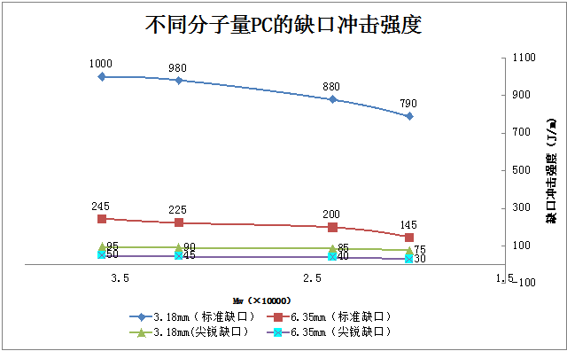 ????????PC樣條的厚度由3.18mm增加到6.35mm時(shí),各分子量PC的缺口沖擊強(qiáng)度數(shù)值下降為原來的20%-25%左右。將樣條缺口由標(biāo)準(zhǔn)缺口改為尖銳缺口時(shí),沖擊強(qiáng)度數(shù)值呈現(xiàn)大幅下降,3.18mm樣條各PC下降到不足原來10%,;而6.35mm樣條尖銳缺口的沖擊數(shù)值下降到原來標(biāo)準(zhǔn)缺口的1/5左右,均表現(xiàn)出脆性。可見,PC對厚度、尤其是缺口有較強(qiáng)的敏感性,PC分子量較高時(shí)這種敏感性稍有減弱。