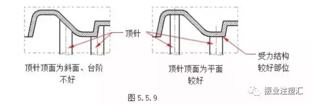 ????????(3)避免跨臺階或在斜面上設(shè)置頂針,頂針頂面應(yīng)盡量平緩,頂針應(yīng)布置于膠件受力較好的結(jié)構(gòu)部位。如圖5.5.9所示。
