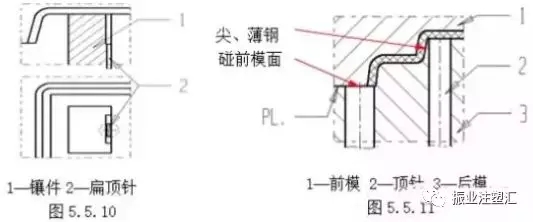 ????????(4)在膠件較深的骨位(深度≥20mm)或難于布置圓頂針時,應(yīng)使用扁頂針。需要使用扁頂針時,扁頂針處盡量采用鑲件形式以利于加工。如圖5.5.10